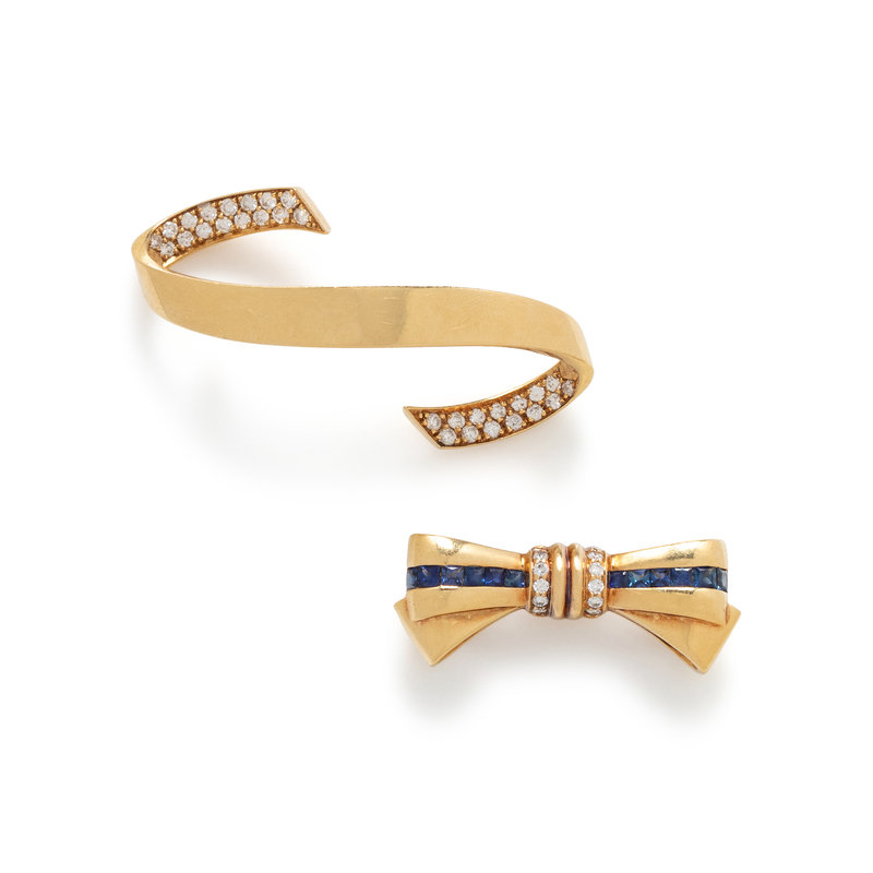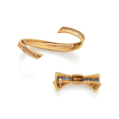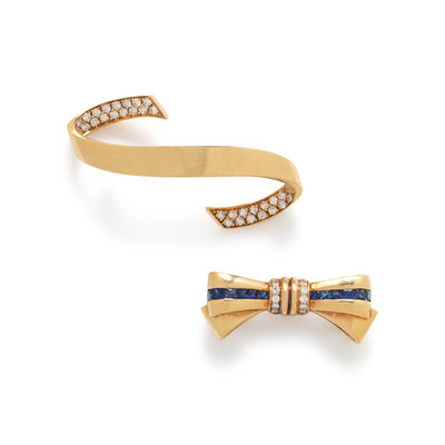 Consisting of a ribbon brooch containing 30 round brilliant cut diamonds weighing approximately 0.90 carat total and bow pin containing French-cut sapphires and round brilliant-cut diamonds. 1 3/4 inches long and 1 3/8 inches long.