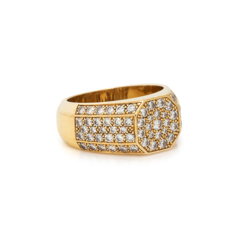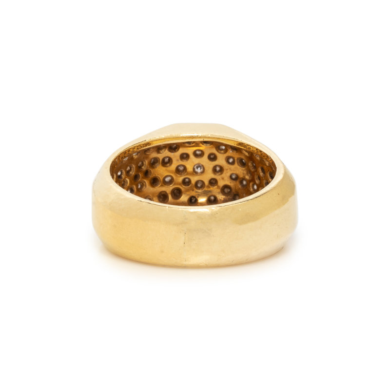 Round brilliant cut diamonds weighing approximately 0.80 carat total. 18 karat yellow gold. Ring size 9.