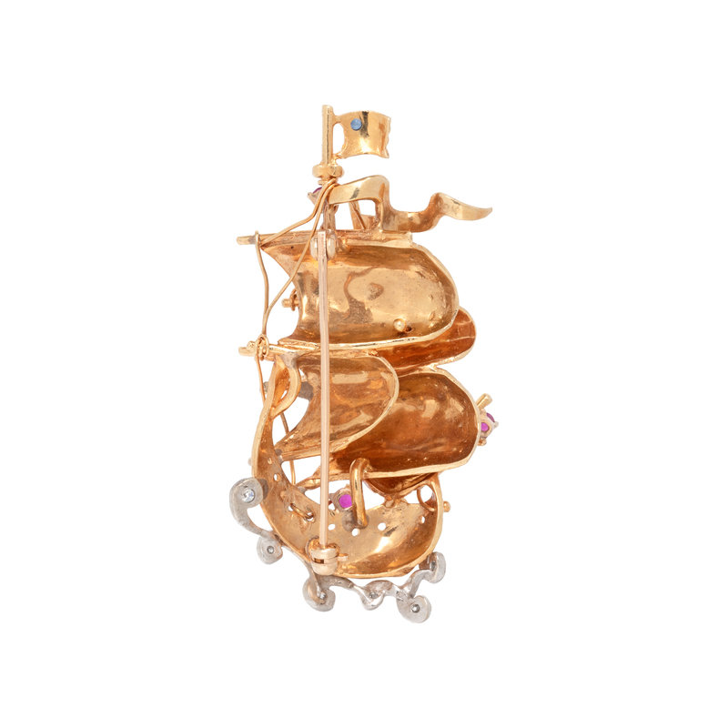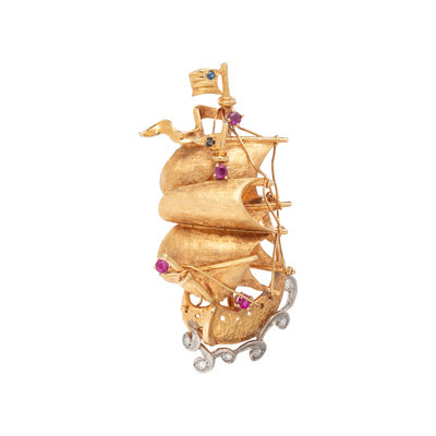 BICOLOR GOLD, DIAMOND AND GEMSTONE SHIP BROOCH