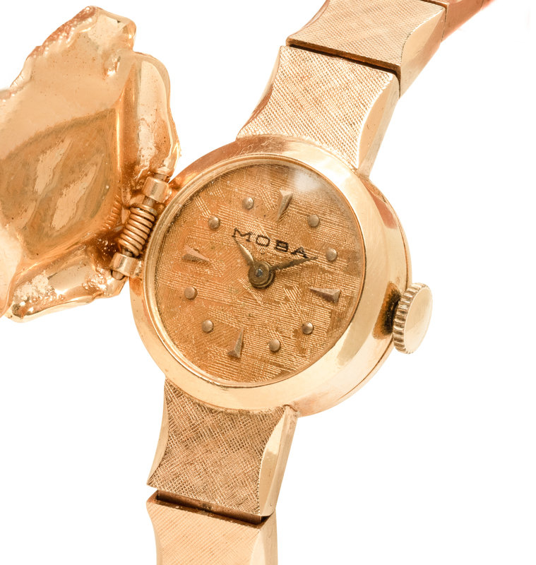 Stamps: Case back: 14K. Clasp: MOBA 14K.