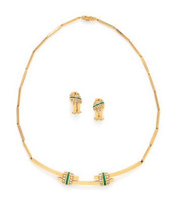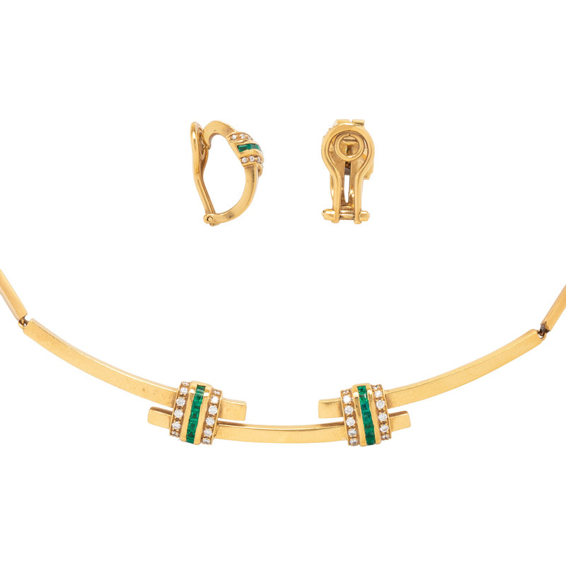 Consisting of a necklace and matching earclips containing calibre cut emerald and round brilliant cut diamonds. Necklace: 16 inches long. Earclips: 5/8 inch long.