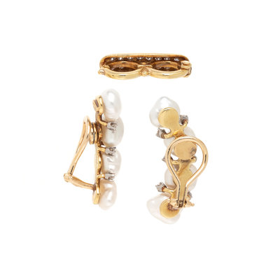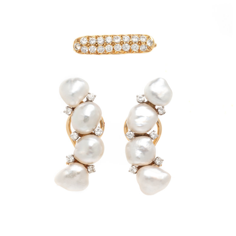 Consisting of a pair of earclips containing cultured baroque pearls measuring 9.00-7.50 mm and round brilliant cut diamonds, together with a yellow gold and diamond necklace shortener. Earclips: 1 inch long. Necklace shortener: 7/8 inch long.