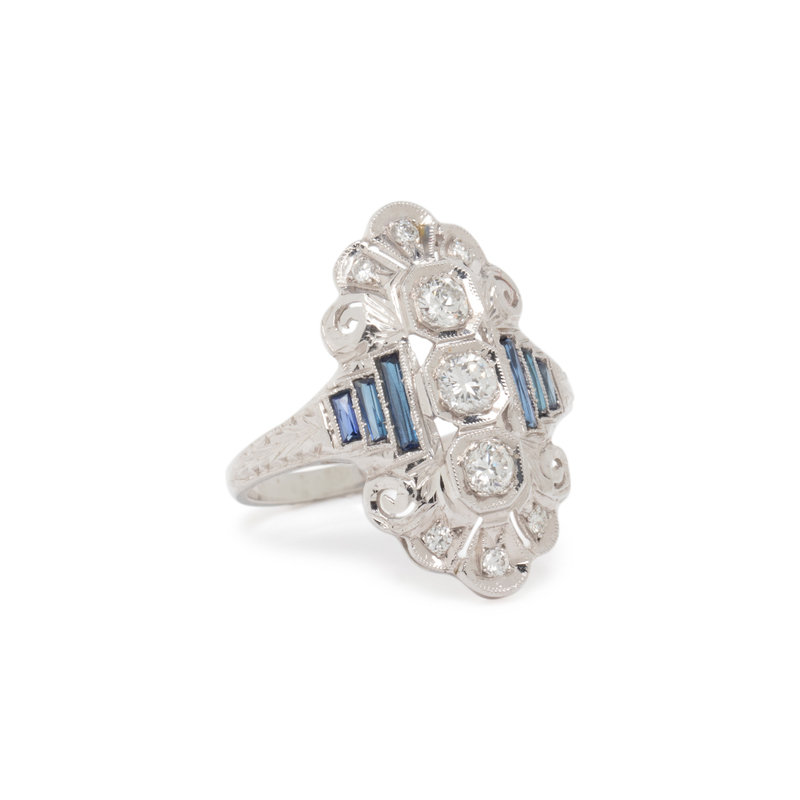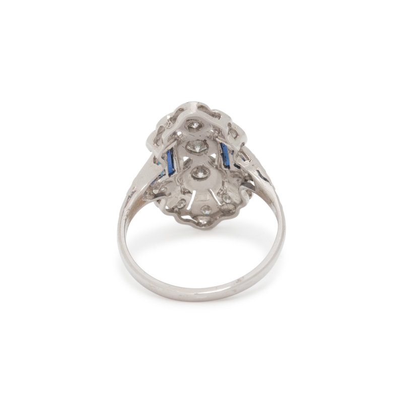 Round brilliant and transitional cut diamonds and rectangular mixed cut synthetic sapphires. 18 karat white gold. Ring size 6 3/4.