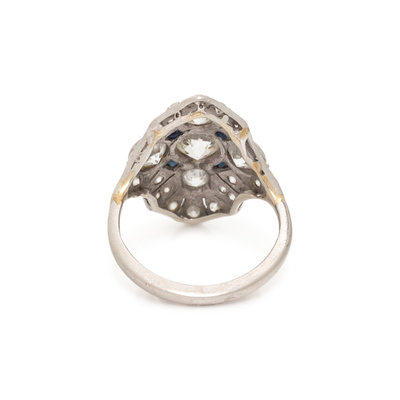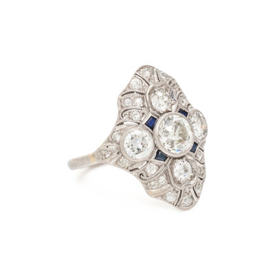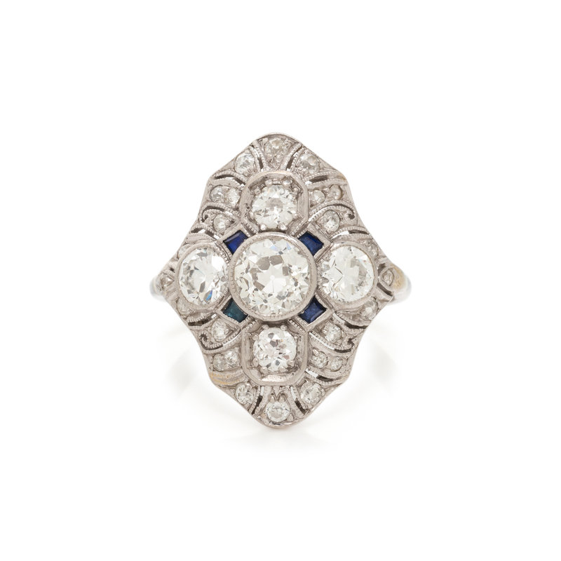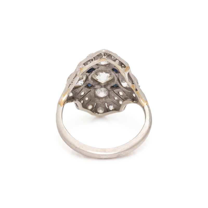 Containing old European cut diamonds weighing approximately 2.25 carats total, four square step cut sapphires. Mounted in platinum. Ring size 7.