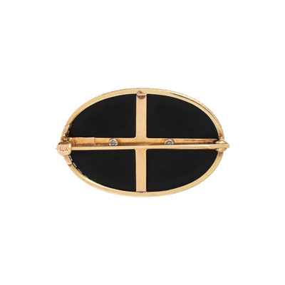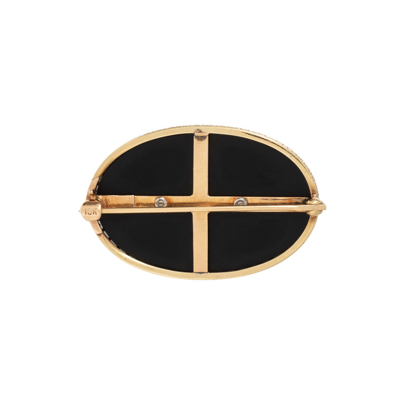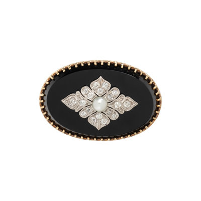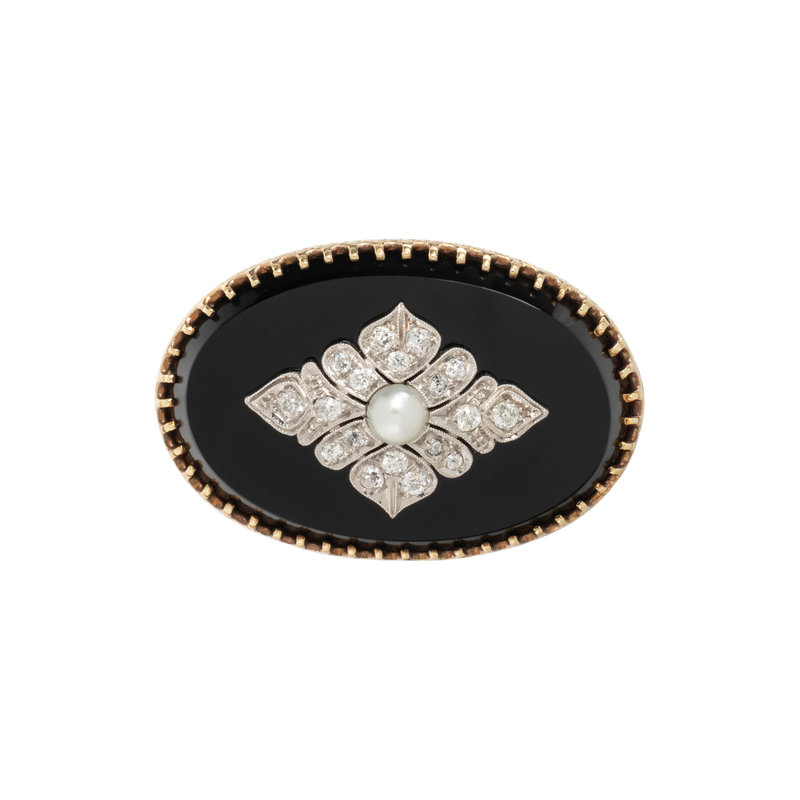 Oval onyx plaque with old mine cut diamonds and one cultured pearl. 10 karat yellow gold and platinum. 1 1/4 inches x 7/8 inch.
