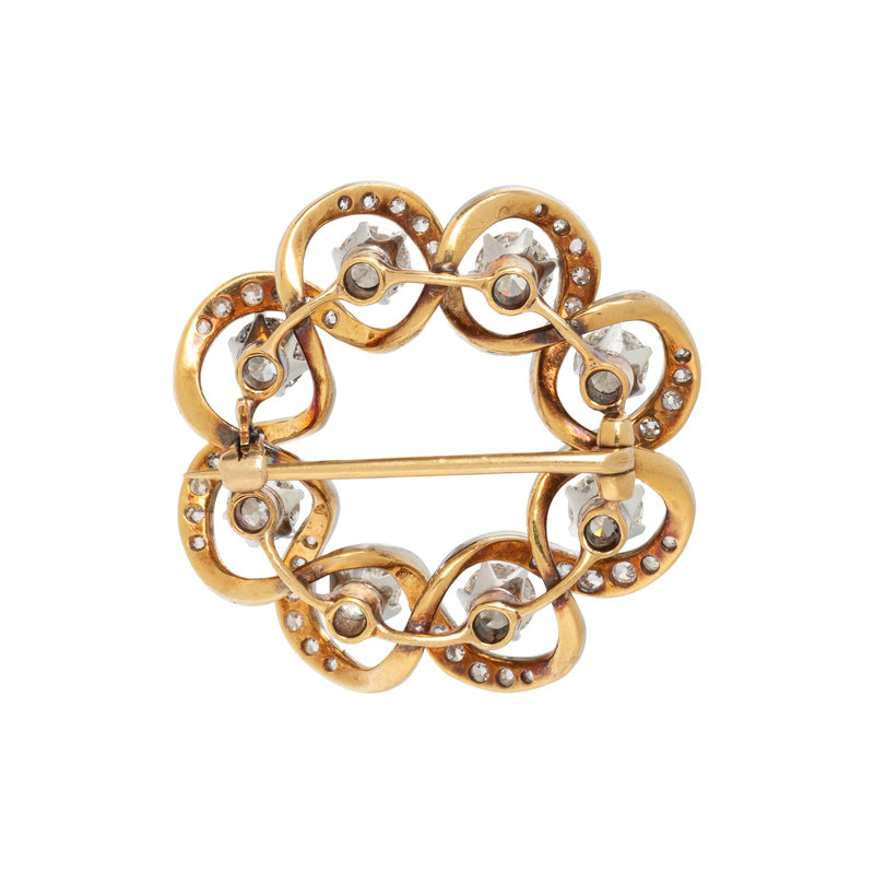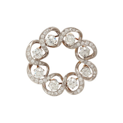 Old European cut diamonds weighing approximately 4.25 carats total. Platinum-topped gold. 1 1/4 inches wide.