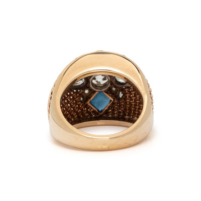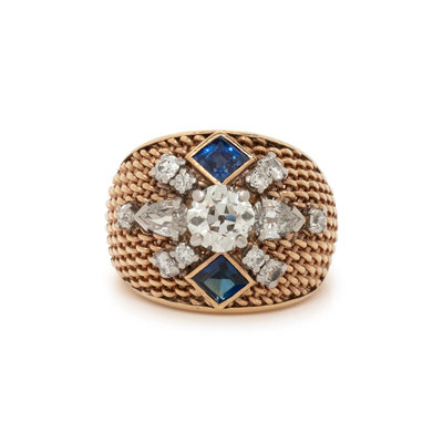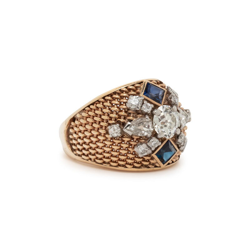 Containing one old mine cut diamond weighing 1.00 carat, old European cut and pear cut diamonds weighing 1.00 carat total, one square step cut natural sapphire. Mounted in 14 karat yellow gold. Ring size 5 3/4.