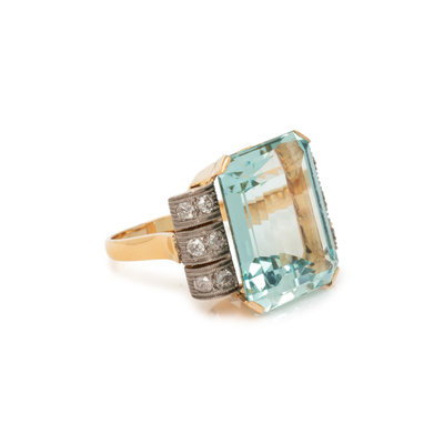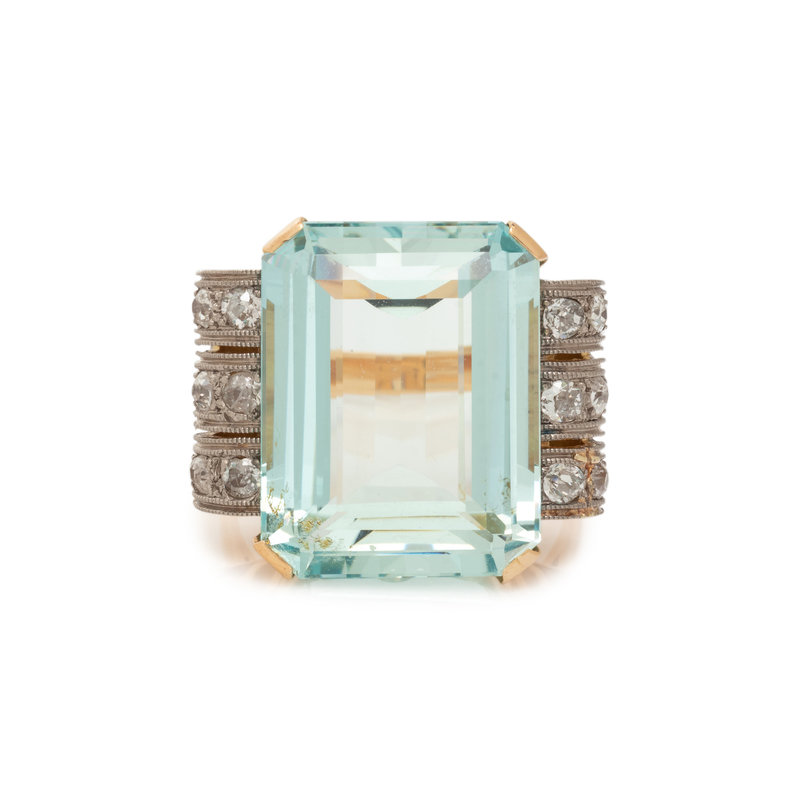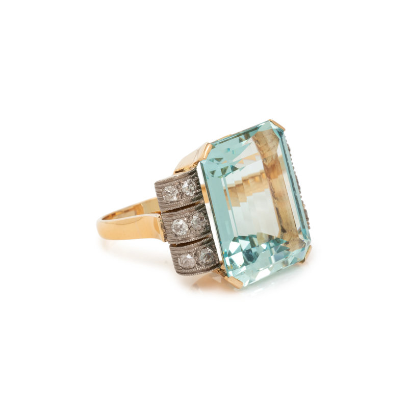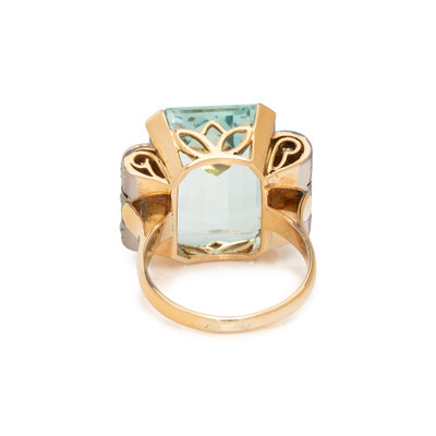 One rectangular step cut aquamarine measuring approximately 19.50 x 15.25 x 8.75 mm and old mine cut diamonds. 14 karat bicolor gold. Ring size 8 3/4.