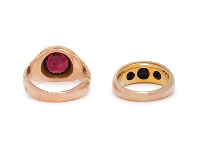 together with a ring containing three round mixed cut garnets. Ring sizes 7 1/2 and 5.