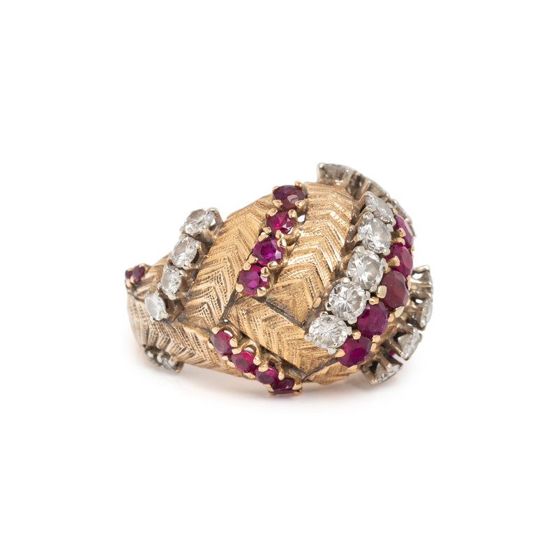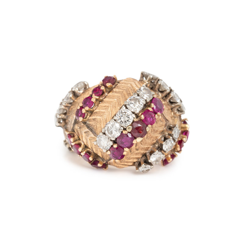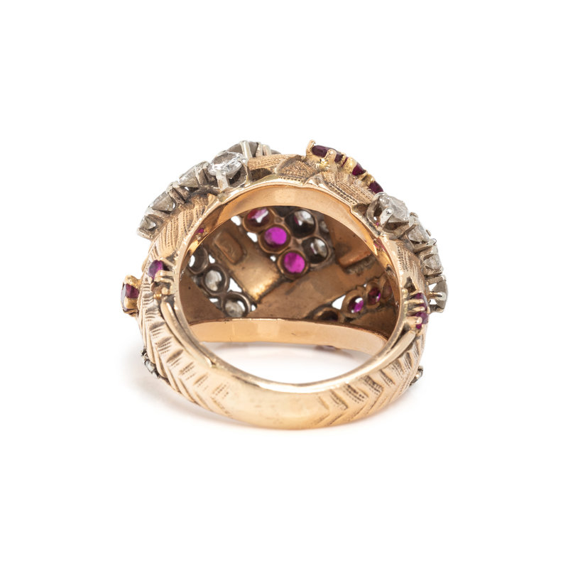 Round brilliant and single cut diamonds weighing approximately 1.50 carats total and round mixed synthetic rubies. 18 karat bicolor gold. Ring size 6 3/4.