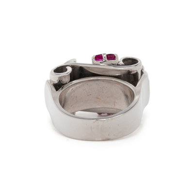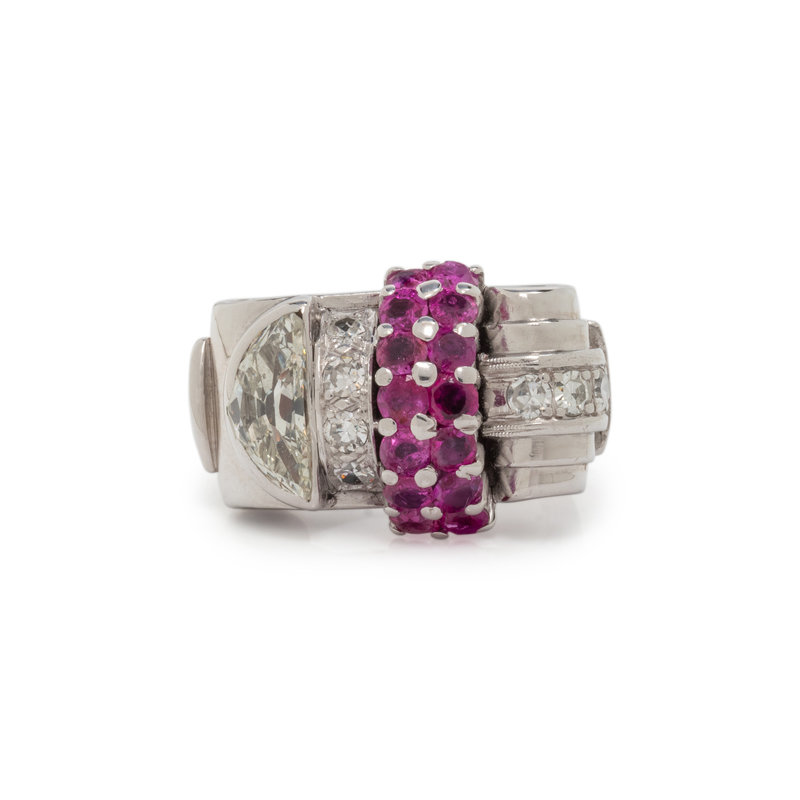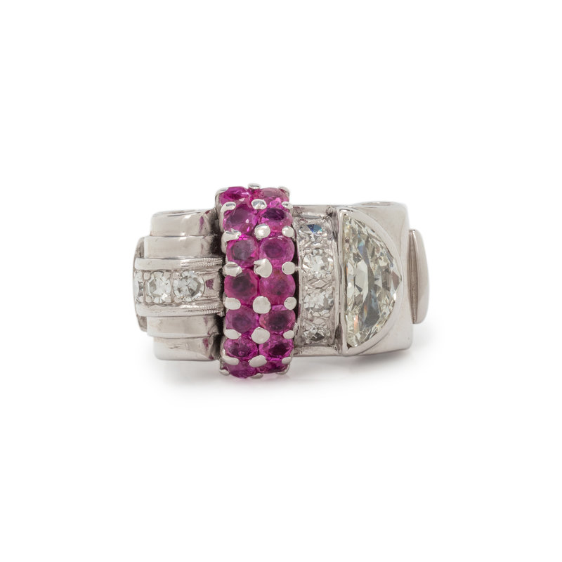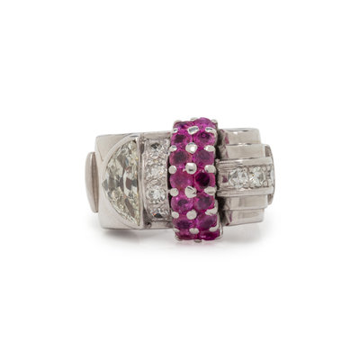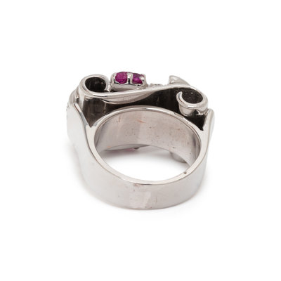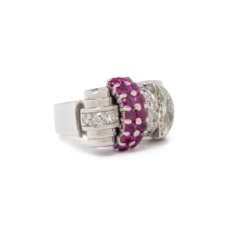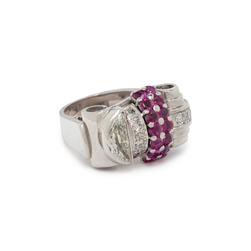 RETRO, WHITE GOLD, DIAMOND AND RUBY RING