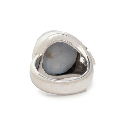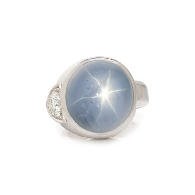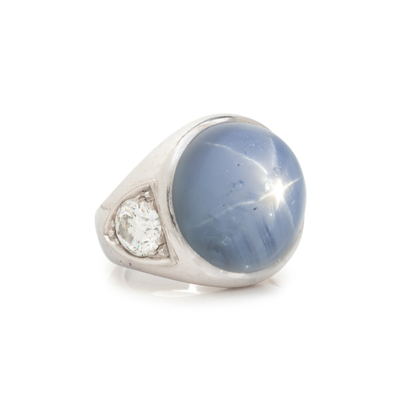Oval cabochon star sapphire measuring approximately 17.00 x 16.00 x 14.50 mm and one round brilliant cut diamond weighing approximately 1.00 carat. Platinum. Ring size 7 1/2.