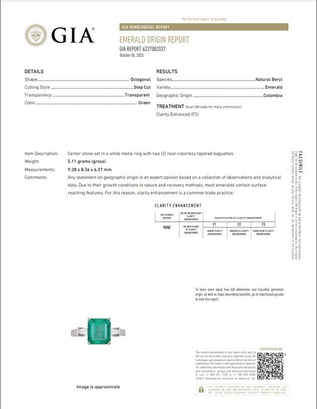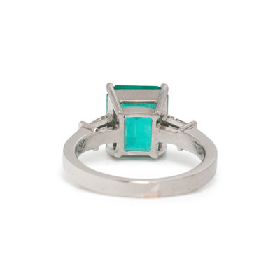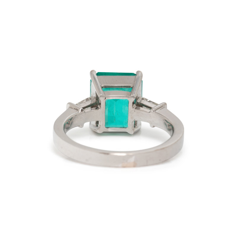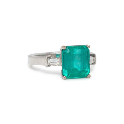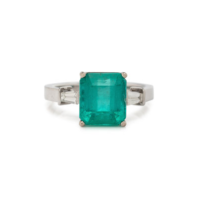 One emerald cut emerald measuring approximately 9.29 x 8.36 x 6.37 mm and two tapered baguette cut diamonds. 18 karat white gold. Ring size 6.