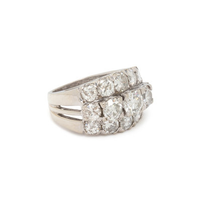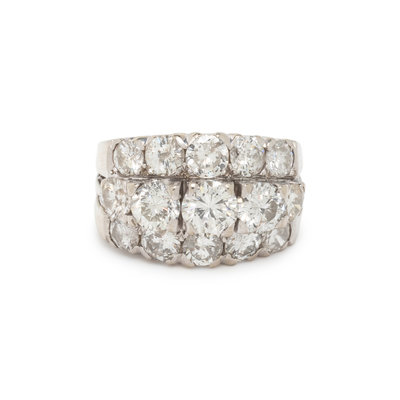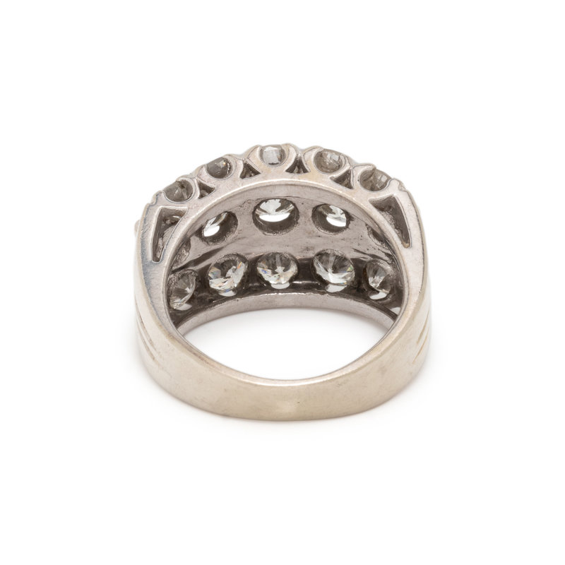 Round brilliant cut diamonds weighing approximately 4.00 carats total. 14 karat white gold. Ring size 5 3/4.