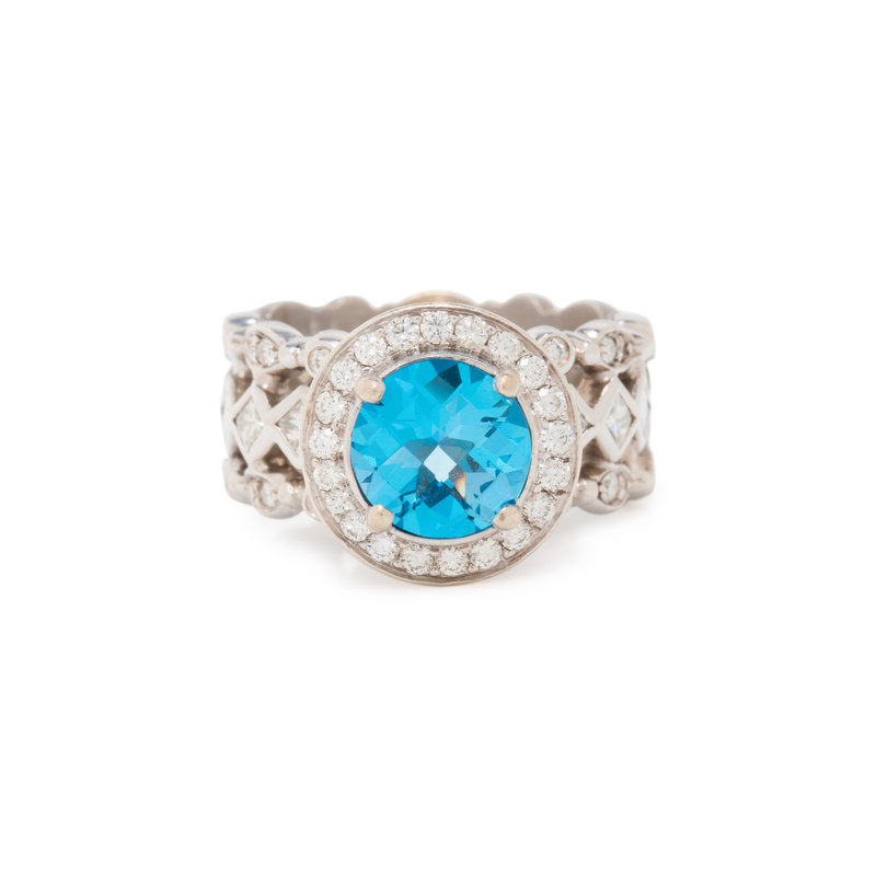 Round mixed cut blue topaz measuring approximately 8.20 mm and round brilliant and princess cut diamonds weighing approximately 1.00 carat total. 18 karat white gold. Ring size 6 1/4.