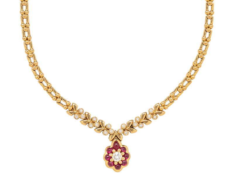 Round brilliant cut diamonds, pear and round cabochon rubies. 18 karat yellow gold. 16 inches long.