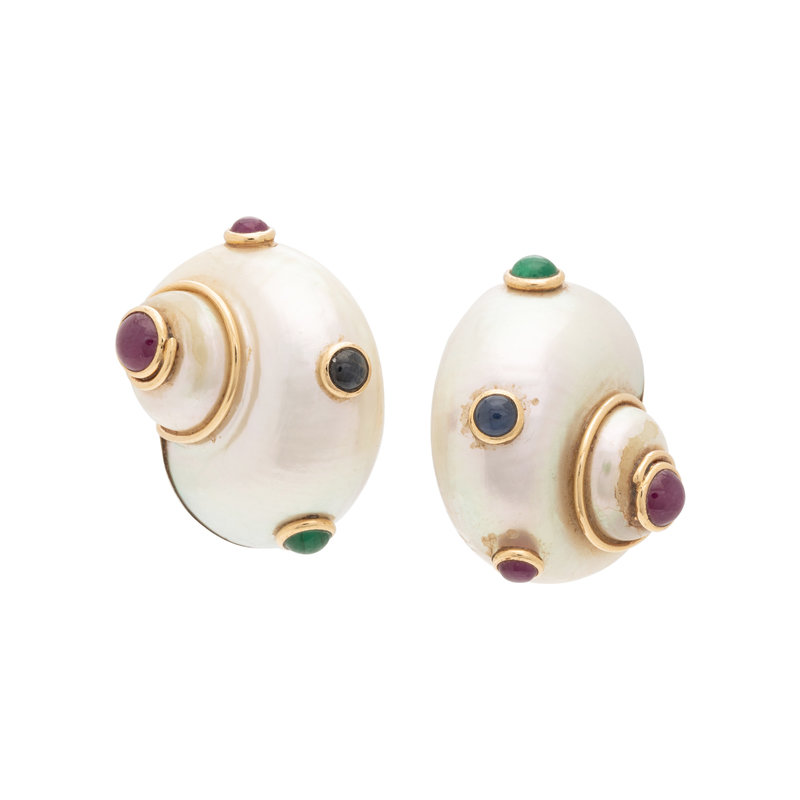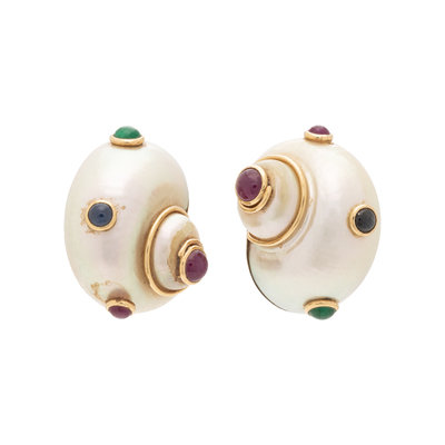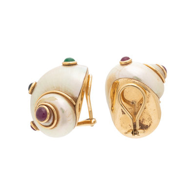 Nautilus shells with applied gold wire and bezel set rubies, sapphires and emeralds. 14 karat yellow gold. 1 inch long.