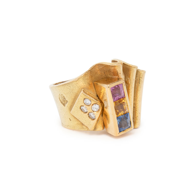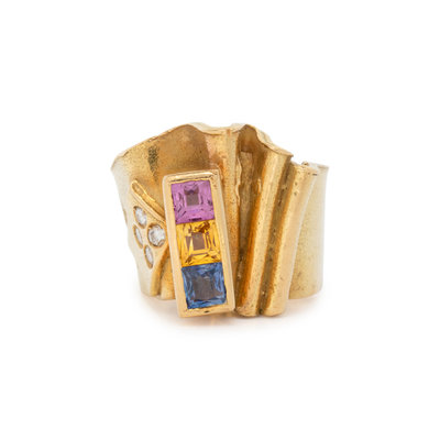 Round brilliant cut diamonds, square mixed cut multicolor sapphires. 18 karat yellow gold. Ring size 6.