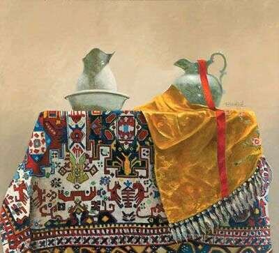 RICHARD HALL (AMERICAN 20TH CENTURY) 'DIALOGUE BETWEEN TWO PITCHERS ON A PERSIAN CARPET'