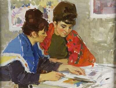 NICOLAI VASSILIEVITCH OVCHINNIKOV (RUSSIAN, 20TH CENTURY) MOTHER AND DAUGHTER LOOKING AT A PHOTO ALBUM