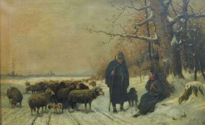 ANDERLY JOHANN MOELLER (GERMAN, B. 1863) HERDERS WITH FLOCK IN WINTER