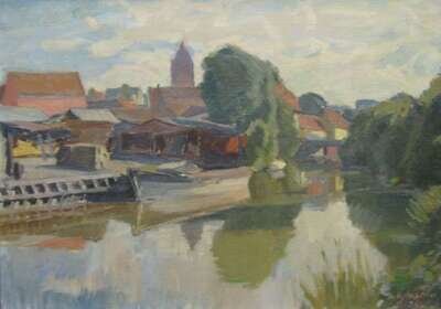ALBERT GEORG KONGSBAK (DANISH, 1877-1958) BOAT ON A CANAL