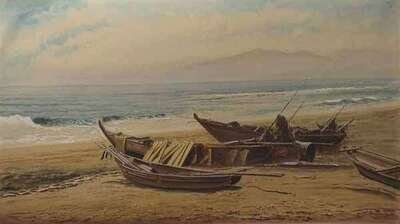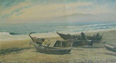 YAMA*** (JAPANESE, 20TH CENTURY) FISHING BOATS ALONG THE SHORE