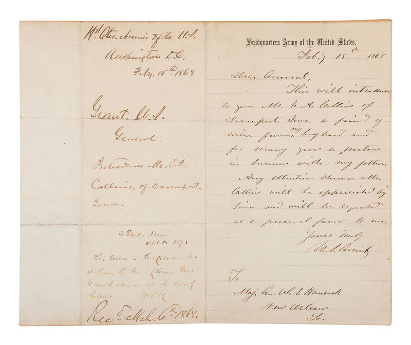 In this letter to General Hancock, General Grant introduces him to a boyhood friend, Mr. E. A. Collins of Davenport, IA. He writes, "Any attention shown Mr. Collins will be appreciate by him and will be regarded as a personal favor to me."