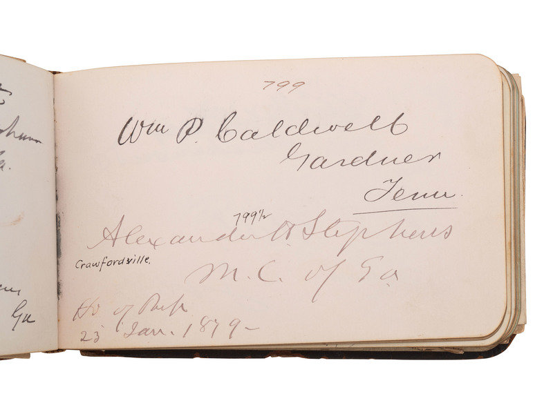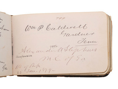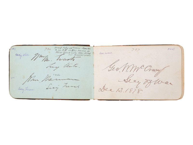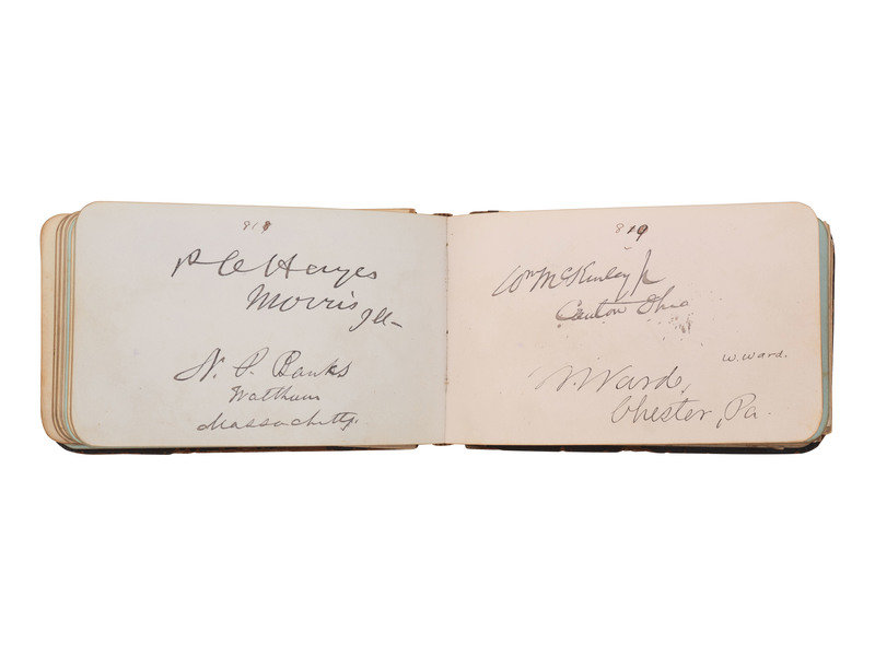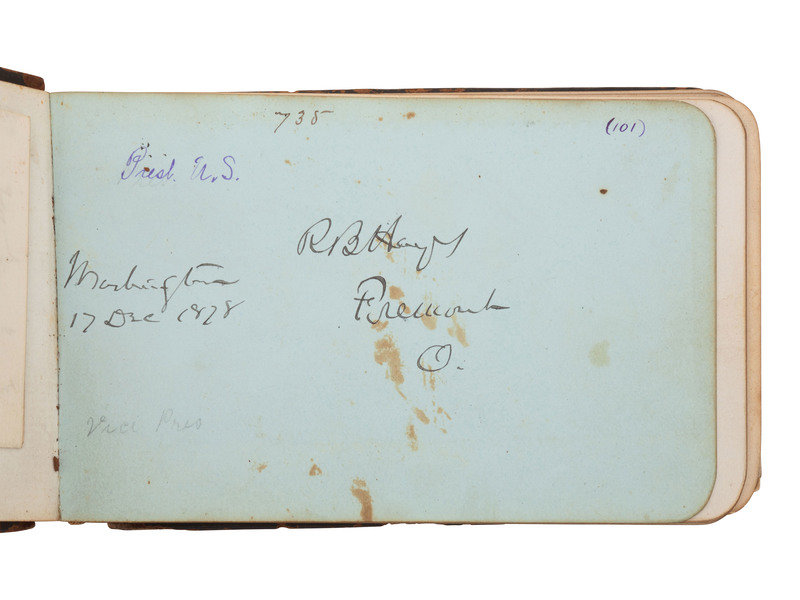 32mo (5 x 3 1/4 in.) leather "Autograph" album containing a collection of autographs, including President Rutherford B. Hayes, members of his cabinet, and the 45th Congress.