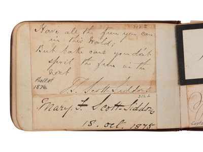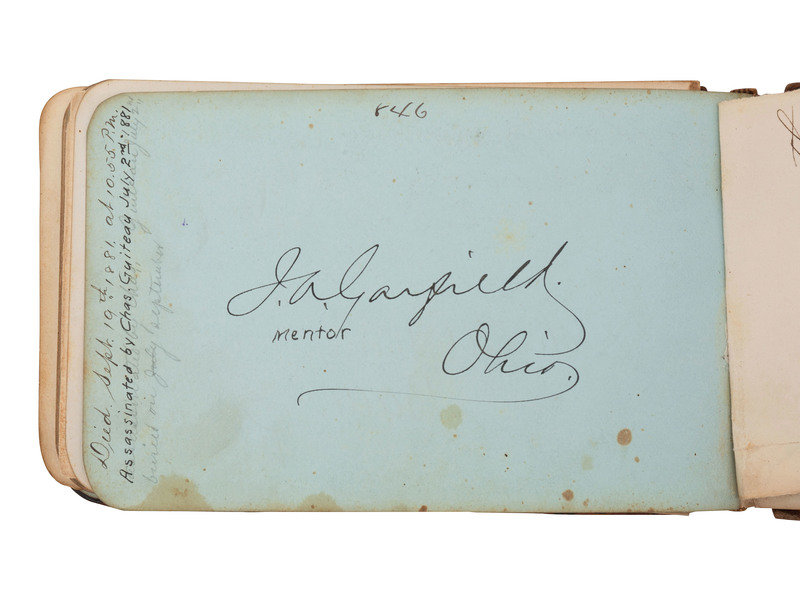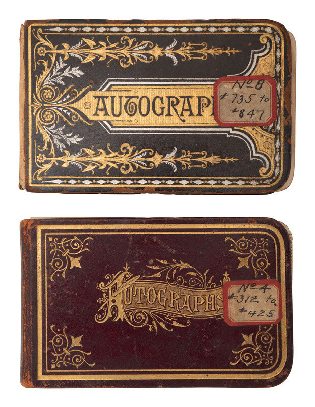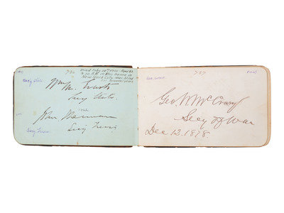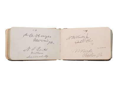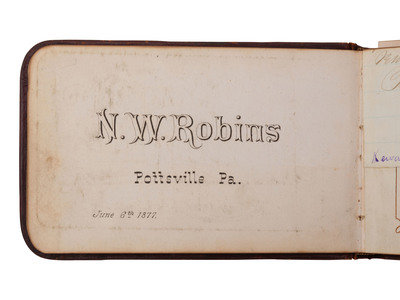 [With:] 32mo (5 x 3 1/4 in.) leather "Autograph" album containing 100+ signatures of Pennsylvania politicians and notable personalities. Front free endpaper identified to the individual who compiled the album, "W.N. Robins, Pottsville, PA, 6 June 1877." In addition to the Pennsylvania politicians, notable signers include: Mary Francis Scott-Siddons, actress; J.F. Hartranft, Governor of Pennsylvania; tipped in letter signed by Lewis Cass, former candidate for US President; Prince Louis Weigand, performer (few pages detached, occasional soiling and edge wear, small notes inscribed throughout the album; wear to covers).