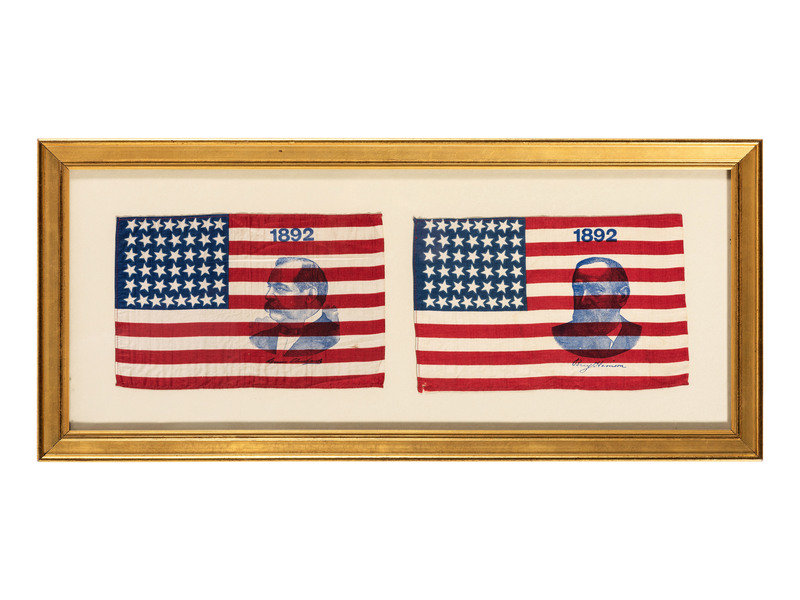 2 silk flags, each 6 1/2 x 10 1/4 in., with 44 printed stars configured in 8/7/7/7/7/8 pattern on a blue canton. Each with overprint on stripes: "1892." First with stamped portrait and signature of Grover Cleveland. Second with stamped portrait and signature of Benjamin Harrison. (Each flag in very fine condition, Harrison flag with light edge wear near lower left corner.) Framed, 12 x 27 1/2 in.