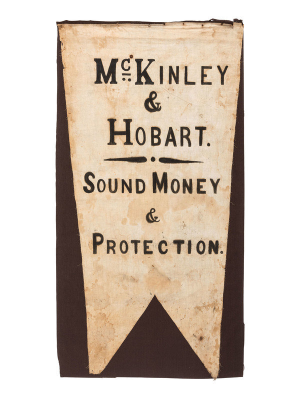 Approx. 35 x 67 in. white cotton banner with hand-painted black letters, top edge hand-stitched to later brown cotton (staining throughout, few scattered holes, fraying, short tears, few areas of loss to edges). A scarce, hand-made banner created in support of William McKinley and Garret Hobart's 1896 run for president and vice president. The banner features the famous slogan "Sound Money & Protection," which was used frequently on flags, posters, ribbons, and buttons produced for the campaign.