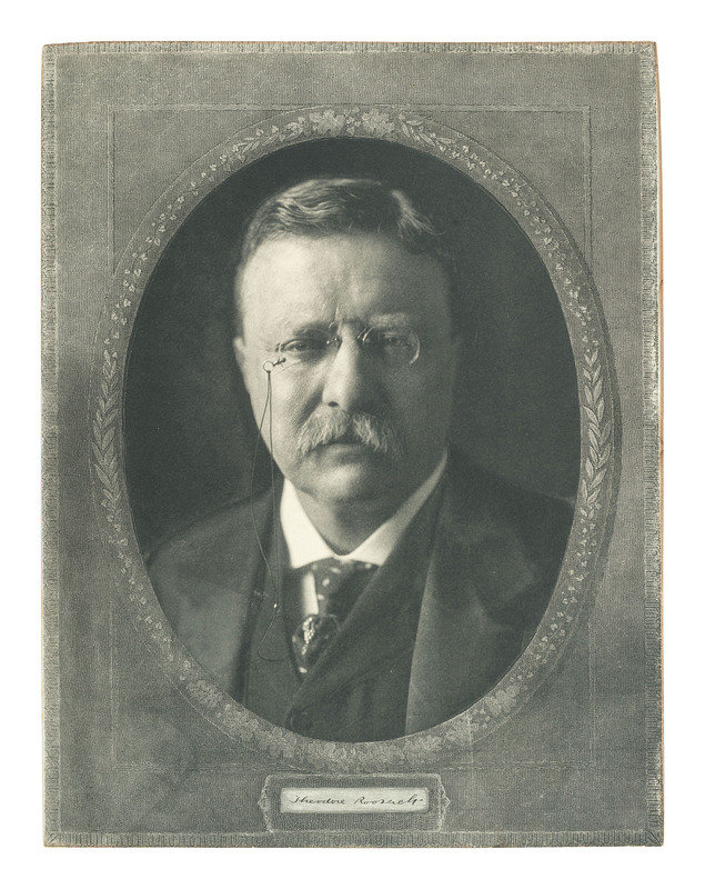 [With:] 9 x 11 1/2 in. photographic printed bust portrait of Roosevelt earing his characteristic spectacles and mustache. Facsimile signature beneath portrait.