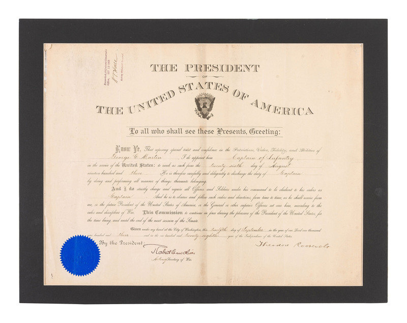21 x 16 in. partly printed document, creasing, tearing, and chipping with loss to edges and a few small interior losses. Also signed by Acting Secretary of War Robert Shaw OLIVER (1847-1935). Affixed with US War Office seal lower left.