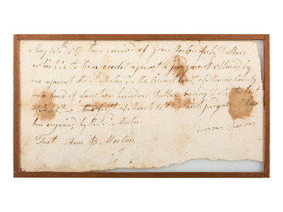 Legendary frontiersman and soldier Simon Kenton signs a receipt acknowledging payment "received of Geo. Morton forty Dollars which is to be a credit against a judgement obtained by me against the sd Morton in the circuit court of Mason County on a bond of fourteen hundred Dollars bearing the Date the last of Feby or the first of March 1801 which judgement has bin enjoind by the sd Morton."