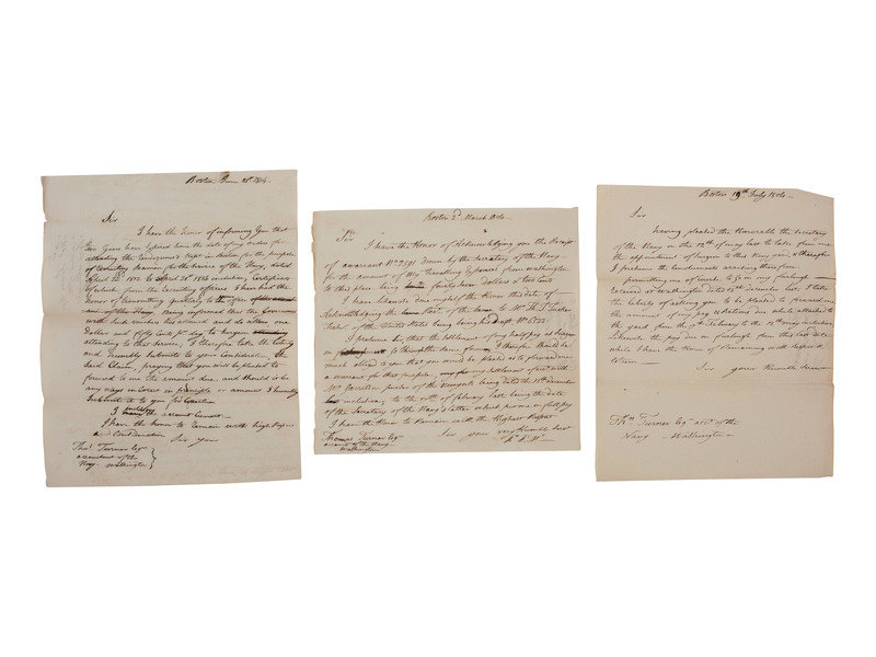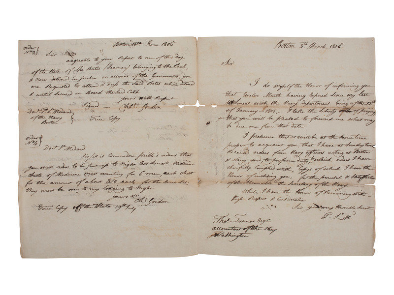 A collection of manuscript documents spanning 2 March 1804 - 27 December 1814. Most being true copies of either Peter St. Medard's (Boston) requests for pay written to Thomas Turner, Esq. of the Navy Department Accountant's Office, or pay orders from Turner (Washington) to Medard. Includes: An undated copy of a document from the US Navy Department to Medard listing his services and consequent pay, amounting to $1,091 for 728 days' service. -- Letter from Medard to Turner, with true copies of orders enclosed. Boston, 3 March 1806. Orders direct Medard to place himself under the command of Lieut. George Lee, who wishes him to examine and report the condition of a prisoner with a sore leg. -- Letter from Medard to Turner requesting pay noting medical services aboard the USS Franklin. Boston, 15 December 1806. "I inclose [sic] you for the satisfaction of the honourable the Secretary of the Navy a copy of a certificate from Lieut. [?] C. [indecipherable] of my active service towards his sick on board of the United States brig Franklin: my exertions have not been the less on board of the United States ketches & Gun Boats while in this port." -- Note from Naval Agent Francis Tohonnot to Major Gills[?]. Boston, 17 October 1809. Requests that the major provide Medard with whatever medicine he may require for the care of "the men sick on board the Chesapeake & recruits on board the Gun Boat." -- And 27 others, docketed verso. -- Together, 31 documents, mostly related to Peter St. Medard's pay from the Navy, many being true copies.