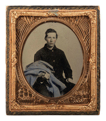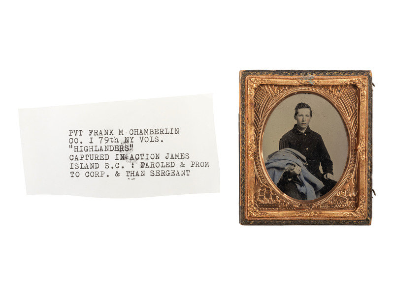Seated portrait of a youthful soldier wearing a regulation 4-button sack coat and having a beautiful blue-tinted infantry greatcoat draped draped over his arm. (Some minor surface imperfections, otherwise great clarity; unsealed.) Housed in a half pressed paper case (surface wear). Pencil inscription on case interior reads, "March 1862, Frank M Chamberlin, Co I. 79th NY Vols, Highlanders."