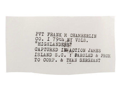 Frank M. Chamberlin claimed to be 21 upon enlistment on 7 March 1862, but given his very youthful appearance in this portrait, it is likely he was a teenager who falsified his age in order to enlist. Private Chamberlain was captured during the slugfest on James Island (Battle of Secessionville) on 16 June 1862, but was quickly paroled two days later. He would be promoted to corporal and sergeant before mustering out on 6 March 1865.