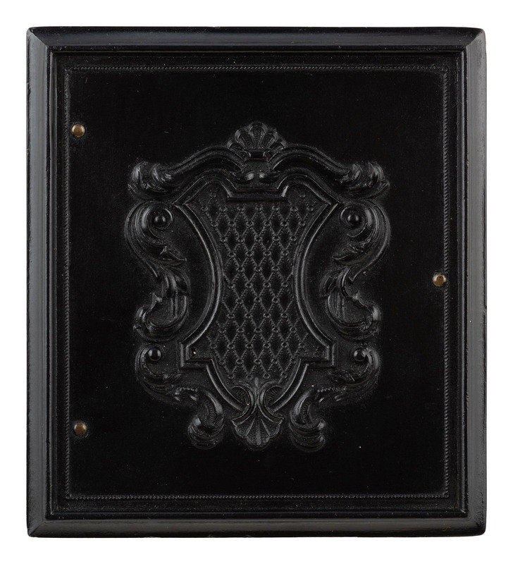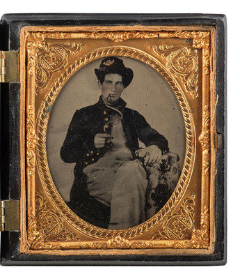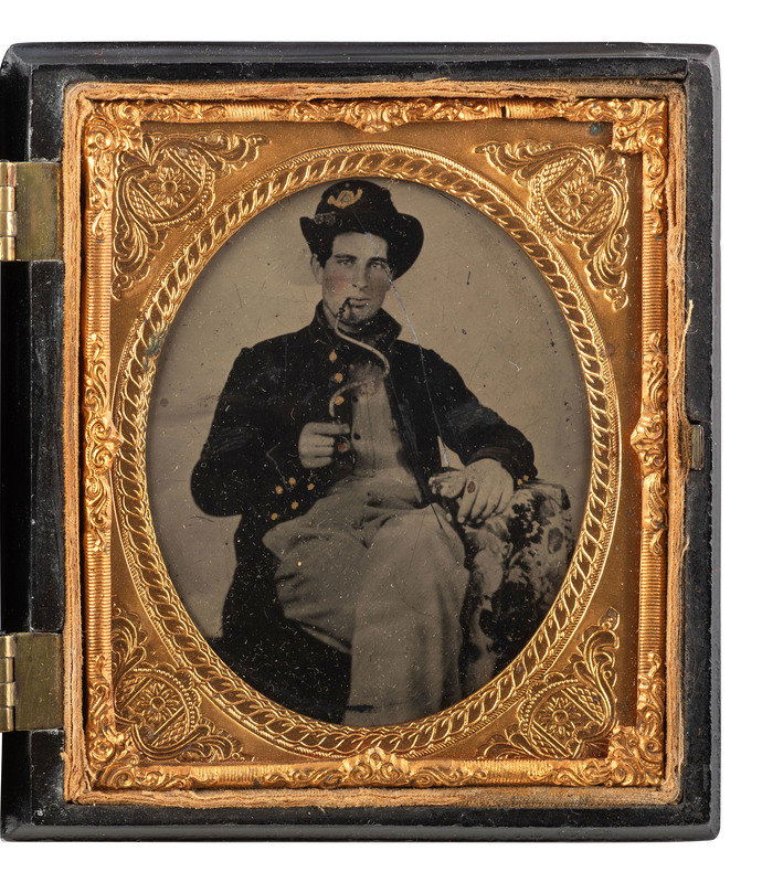 Casual portrait of a seated federal soldier wearing a rare gray shirt, visible under his unbuttoned frock coat, and a Hardee hat with gold-highlighted hunting horn (infantry) insignia. He uses a long, curvy pipe apparatus to enjoy a smoke as the photographer captures his likeness. (Some surface rubs/abrasions and scratches with loss, light vertical bends to far left side extending the length of the plate; unsealed.) Housed in a geometric Union case [Berg 3-195] (non-functioning closure, small nicks to edges). The subject's attire and overall aura suggests a western theater designation.