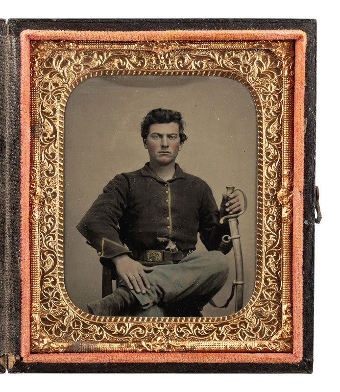 Seated portrait of a handsome young soldier wearing his blue-tinted trousers and a hard expression. He holds his saber down against the floor by its grip with one hand, and wears his pistol tucked into his belt just to the side of his rectangular eagle belt plate. (Small area of darker coloration to upper edge, remarkably clear image, some spotting to mat and preserver; unsealed.) Housed in a pressed paper case (surface wear).