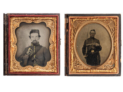 Tintype standing portrait of a triply armed cavalryman holding an 1851 Colt Navy across his chest with one hand and a cavalry saber with the other. He wears a third, unidentifiable revolver in his belt (Image somewhat dark, with spotting and surface scratching and texturing throughout ; unsealed.) Housed in a pressed paper case with patriotic embossment on front cover (discoloration and significant wear throughout). -- Ruby ambrotype seated portrait of a bearded, doubly armed cavalryman grasping his 1840 heavy cavalry saber with one hand and wearing what appears to be a Savage Navy revolver in his belt. (Heavy spotting, some chemical deterioration/discoloration along edges; unsealed.) Housed in a pressed paper case (discoloration to satin pad). -- Together, 2 sixth plate images featuring heavily armed cavalrymen.
