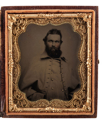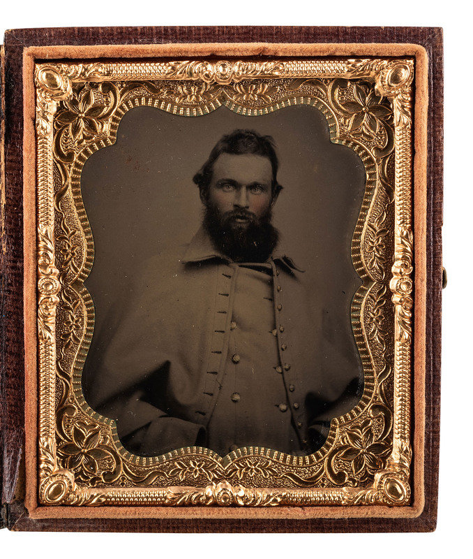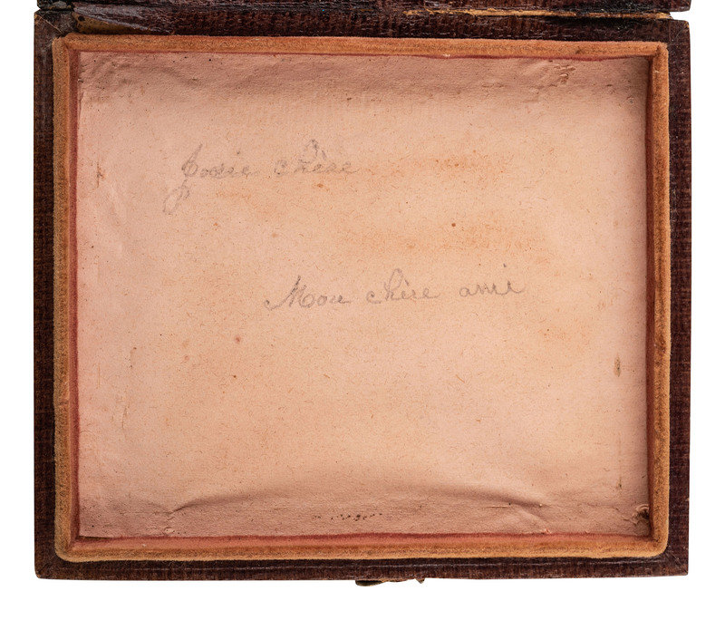 Sixth plate, hand-tinted tintype of a Federal cavalryman wearing a regulation double-breasted enlisted overcoat having a cape which buttons down the front. (Slightly soft in clarity, minimal edge wear including slight crease near top edge of plate, else very good.) Housed in a full pressed paper case with penciled notation behind image, which reads, "Josie chere, Mon chere amie" (areas of surface loss).
