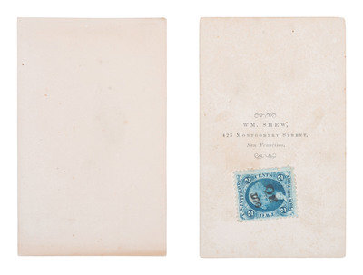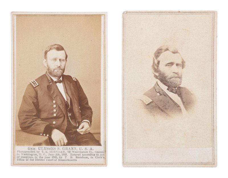 4 CDVs of Ulysses S. Grant, most in uniform, each approx. 2 1/8 x 3 1/4 in. on cardstock mount (light soiling, some with edge wear including trimmed edges). Includes: Seated portrait of General Grant wearing 4 stars. Boston, MA: T.H. Burnham, 1868. -- Seated portrait of General Grant. San Francisco, CA: Wm. Shew, ca 1864-1865. 2-cent US Internal Revenue stamp on verso (partially separated from mount). -- Vignetted portrait of General Grant, n.d. Giesboro, DC: Gideon Smith. -- Vignetted portrait of Grant, possibly in civilian clothing. New York: C.W. Thorne, n.d.