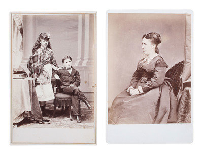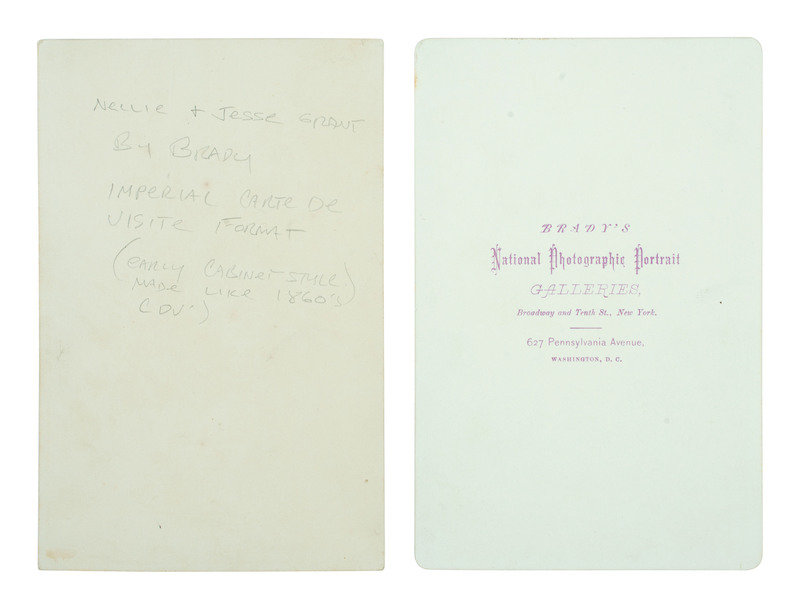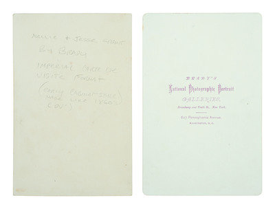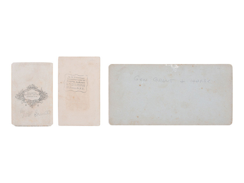 [With:] Genl. Grant & His War Horse. Washington, DC: J.F. Jarvis, n.d. 6 1/8 x 3 1/8 in. stereoview on cardstock mount (light, occasional spotting). -- "Imperial carte de visite" of Julia Dent Grant, wife of Ulysses S. Grant. New York and Washington, DC: Brady's National Photographic Portrait Galleries, ca 1860s. 4 x 5 3/8 in. albumen photograph on cardstock mount, which is thinner than later cabinet card mounts. -- "Imperial carte de visite" of Nellie and Jesse Grant, children of Ulysses S. Grant. Uncredited, but likely taken by Brady's National Photographic Portrait Galleries, ca 1860s. 4 x 5 1/2 in. albumen photograph on cardstock mount, which is thinner than later cabinet card mounts.