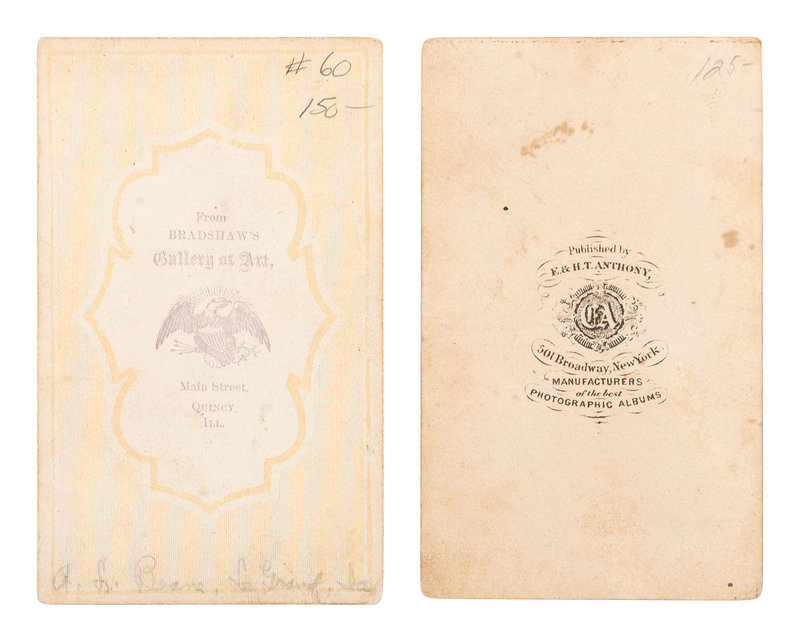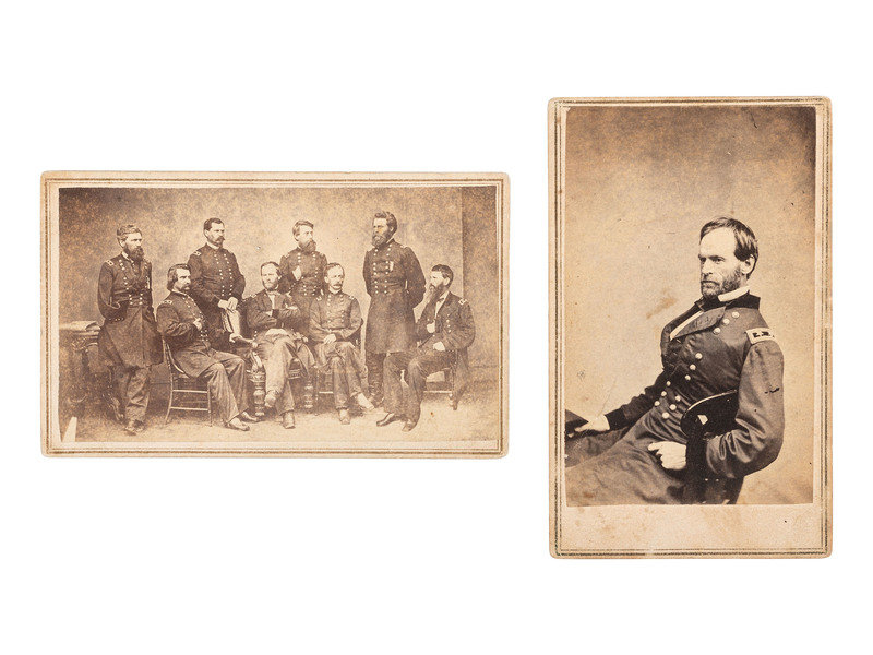 [With:] CDV of William T. Sherman as major general. New York: E. & H.T. Anthony, n.d. -- CDV, studio portrait of Major General W.T. Sherman and his generals in 1865. Quincy, IL: Bradshaw's Gallery of Art, n.d. Sherman sits with (from left to right) Major Generals John A. Logan, Henry W. Slocum, and Francis Preston Blair, Jr. Standing: O.O. Howard, William B. Hazen, Jeff C. Davis, and J.A. Mower. -- 2 CDVs, 2 1/8 x 3 3/4 in., or smaller, on cardstock mounts. Condition generally good, with some toning, occasional soiling, and edge wear to mounts.
