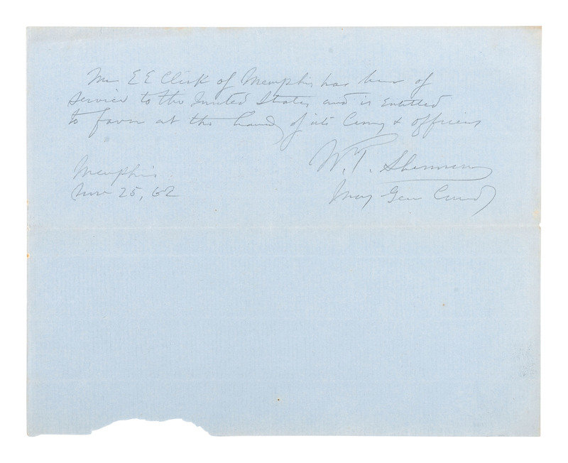 1 page, 7 7/8 x 6 1/4 in., fold lines, trimmed/torn along bottom edge. Sherman writes, "Mr. E.E. Clark of Memphis has been of service to the United States and is entitled to favor at the hand of [its? C?] & officers." Signed by Sherman as "Maj. Gen. Comd."