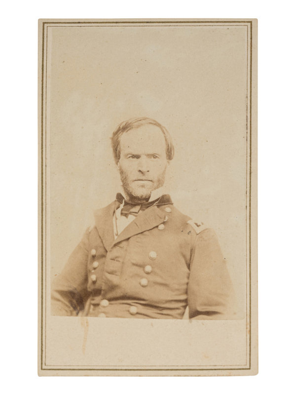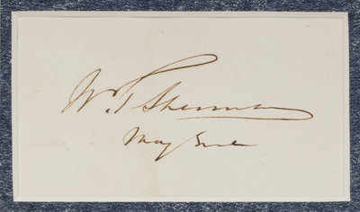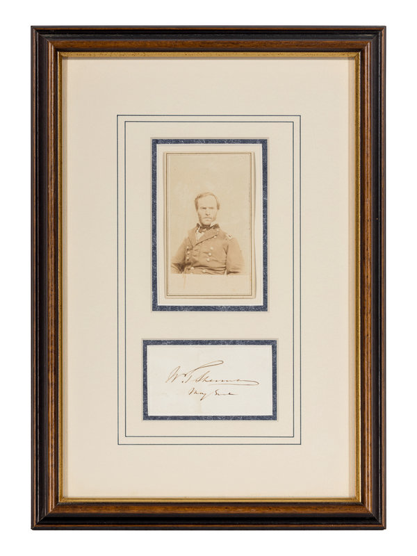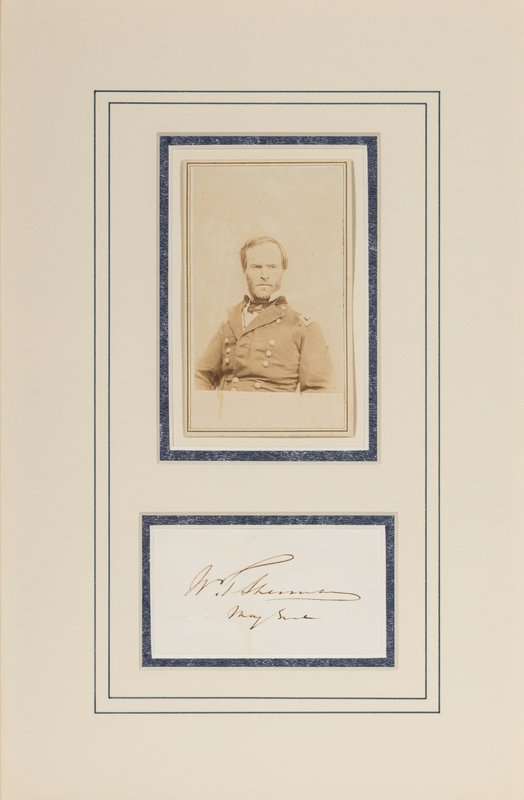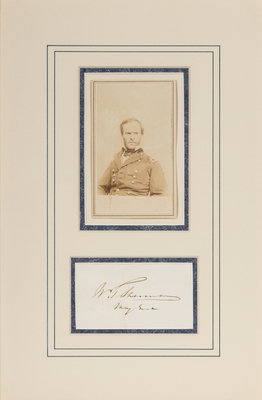 Clipped signature ("W.T. Sherman, Maj. Genl."). 3 1/4 x 1 3/4 in. (sight) (very good condition). -- CDV of General William T. Sherman. New York: E. & H.T. Anthony, n.d. 2 1/8 x 3 1/4 in. CDV on cardstock mount (some fading to image). -- Clipped signature and CDV matted and framed together, 9 1/2 x 13 1/2 in. (unexamined outside frame).