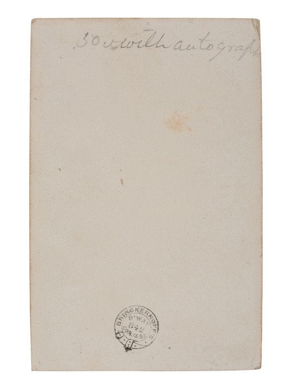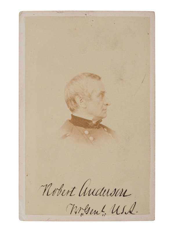 2 5/16 x 3 11/16 in. CDV on cardstock mount (image toned, with few punctures to upper edge and light soiling/spotting; wear to mount edges and corners). Signed on image "Robert Anderson Br. Genl. USA." Verso stamped for Brinckerhoff's studio on Broadway. Anderson is featured in profile, wearing his uniform coat.