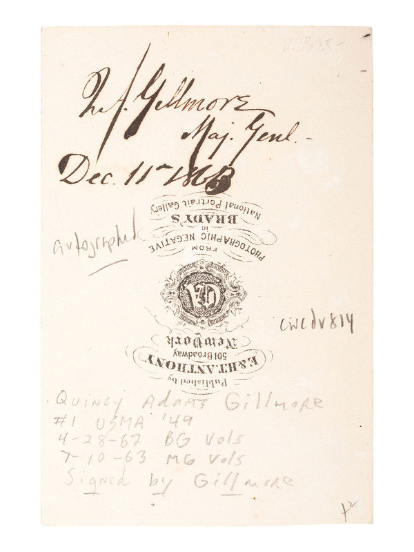 2 1/8 x 3 1/4 in. CDV on cardstock mount (trimmed at bottom). Mount verso signed ("Q.A. Gillmore, Maj. Genl."), and dated 11 December 1863 (inkblot near "3" in "1863"). Brady/Anthony imprint on verso.