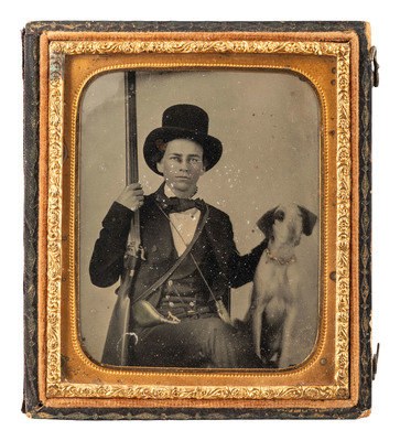 Sixth plate ambrotype of Taliaferro "Tally" Simpson seated against a simple studio backdrop, posed holding shotgun in one hand while trying to keep his dog in place, who appears slightly blurred as a result of moving. Simpson is shown in civilian attire, wearing a top hat, bowtie, overcoat, and vest. He has both a shot pouch and powder flask, indicating that he is ready for the hunt. (Very good clarity, few small areas of loss to varnish, dust/dirt that appears to be trapped under the glass, original seals.) Housed in a half pressed paper case, with penciled and inked notations behind the image (many indiscernible) with the exception of the name "Taliaferro Simpson."